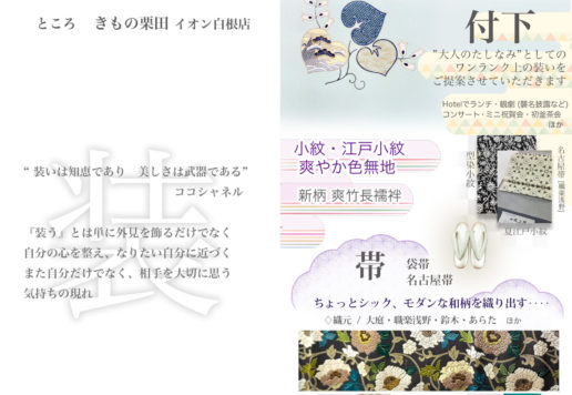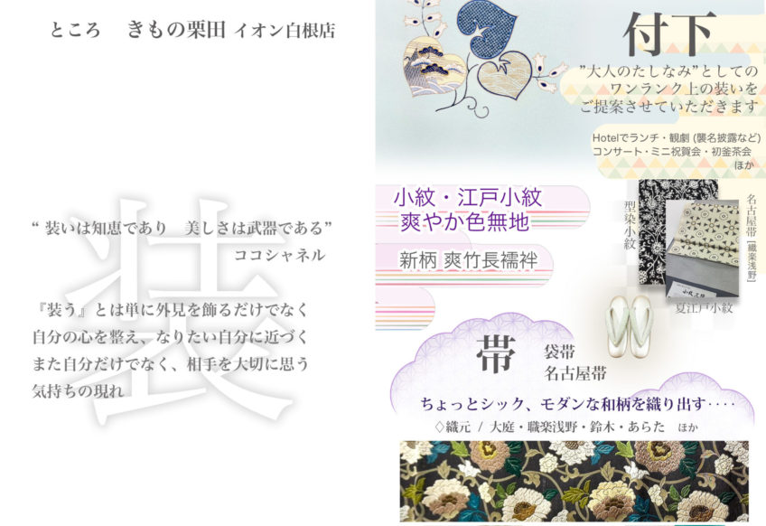 きもの栗田は、お客様と共に”着物をたのしむ”というスタイルを心がけております。着物を着装する機会を増やしていただければと思い、お客様が喜んでいただける企画を一年のうち2〜3回程行っております。今まで企画したイベントの数々もご好評いただいております。
